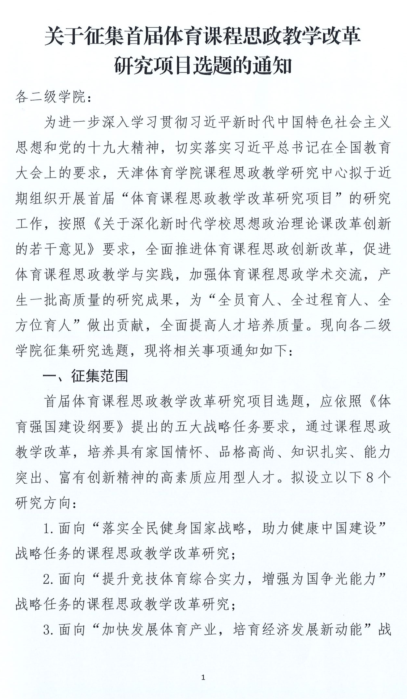 关于征集首届体育课程思政教学改革研究项目选题的通知