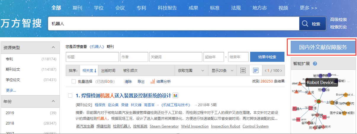 资源检索:检索结果页面,通过一框式检索右侧 “国内外文献保障服务” 标 签可以直接访问“国内外文献保障服务”。在文献检索列表页可以针对检索结果进行筛选,同时支持相关度、时间、题名的排序。
