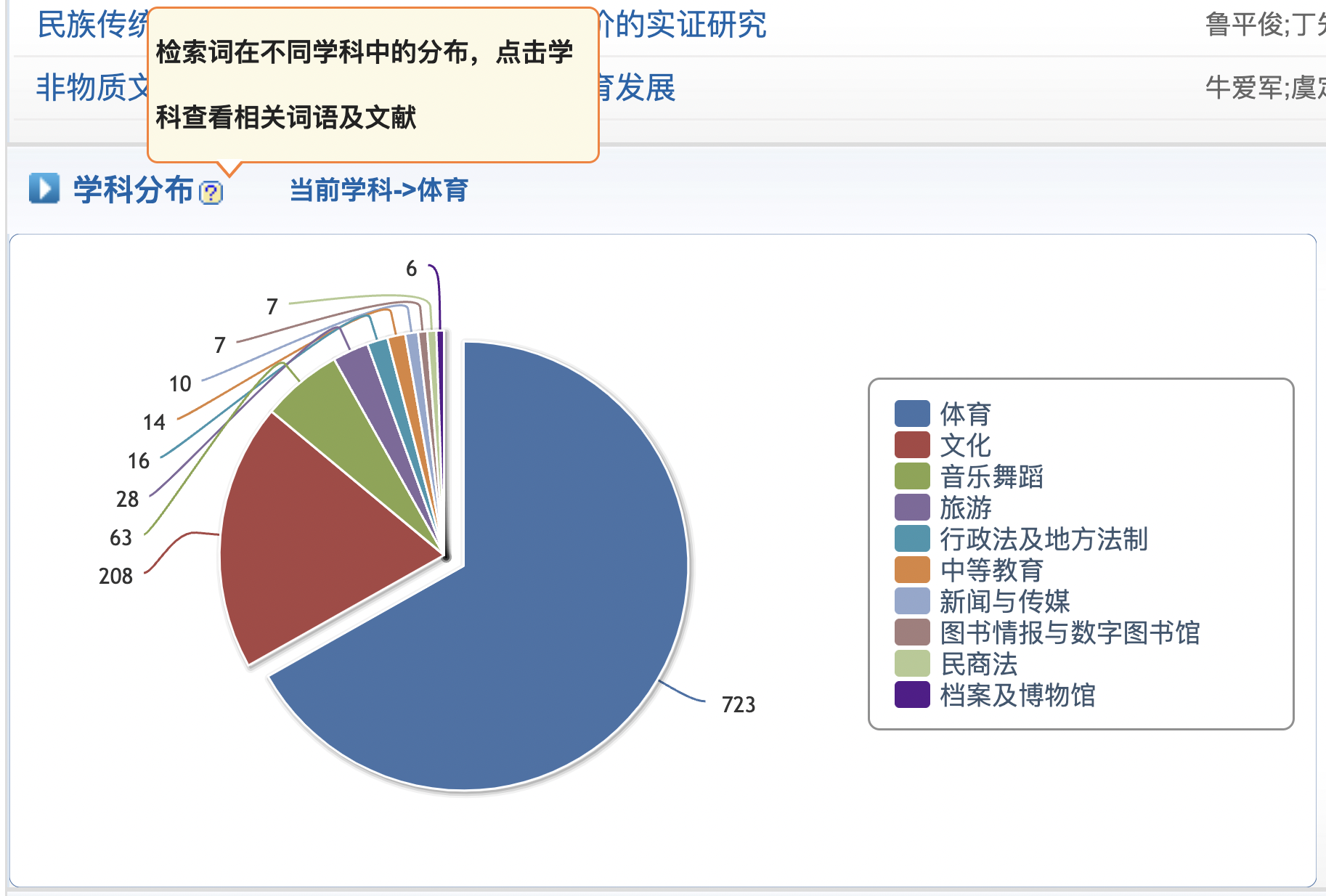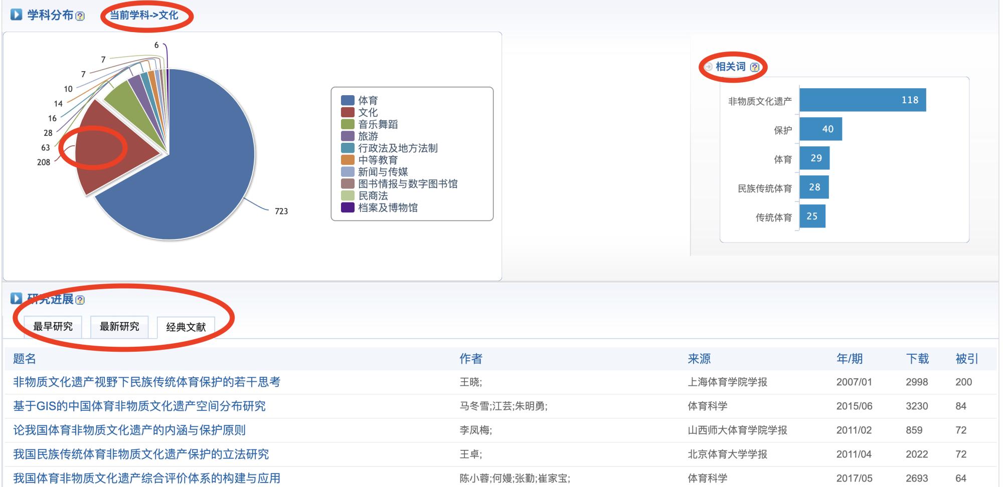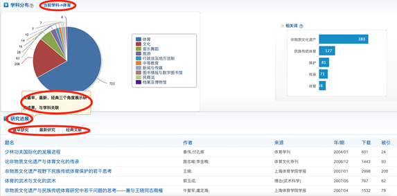 也就是说,学科分布的可视化分析和下方的研究进展文献列表是联动的。在饼图上,选择有关“体育非物质文化遗产”研究文献不同的学科分布,右边会呈现不同的相关词,下方的研究进展会展现该学科下最早、最新和经典文献。