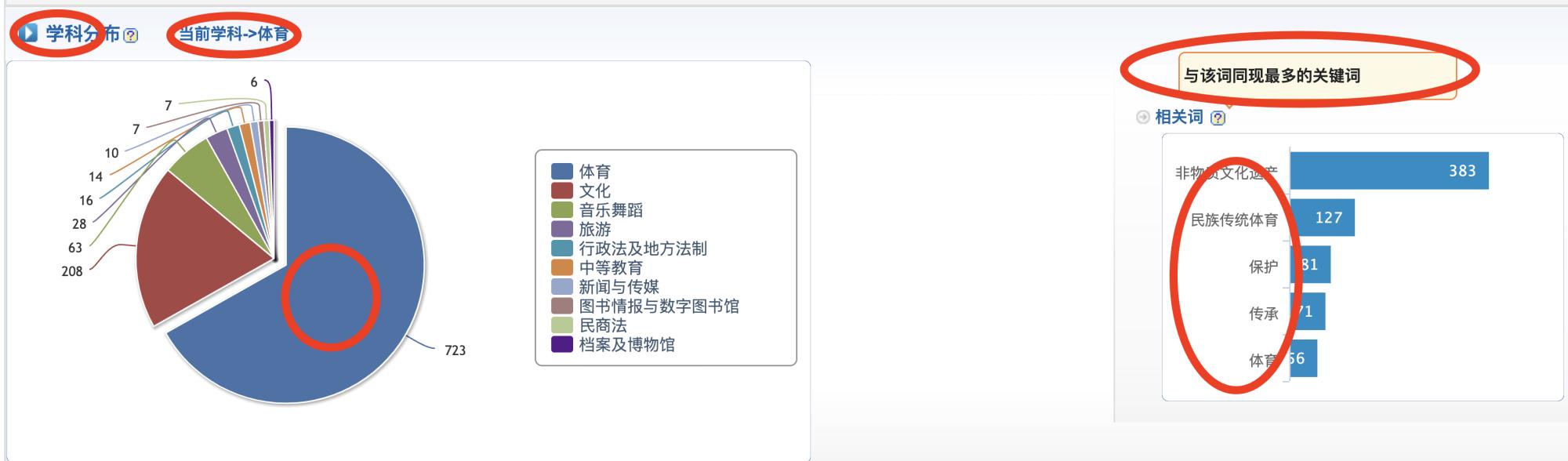 还是以“体育非物质文化遗产”研究为例,在学科分布饼图可视化分析中,可以看到与主题相关的研究主要分布在哪些学科。点击不同学科板块,右侧就会呈现该学科的相关热点词,也就是与检索词同现最多的关键词。