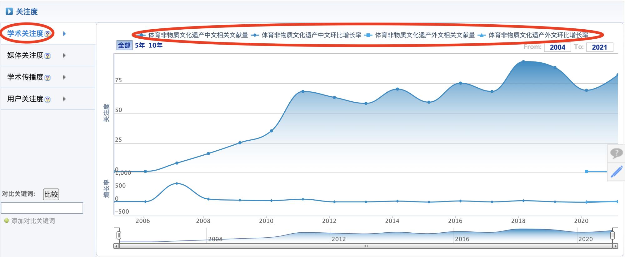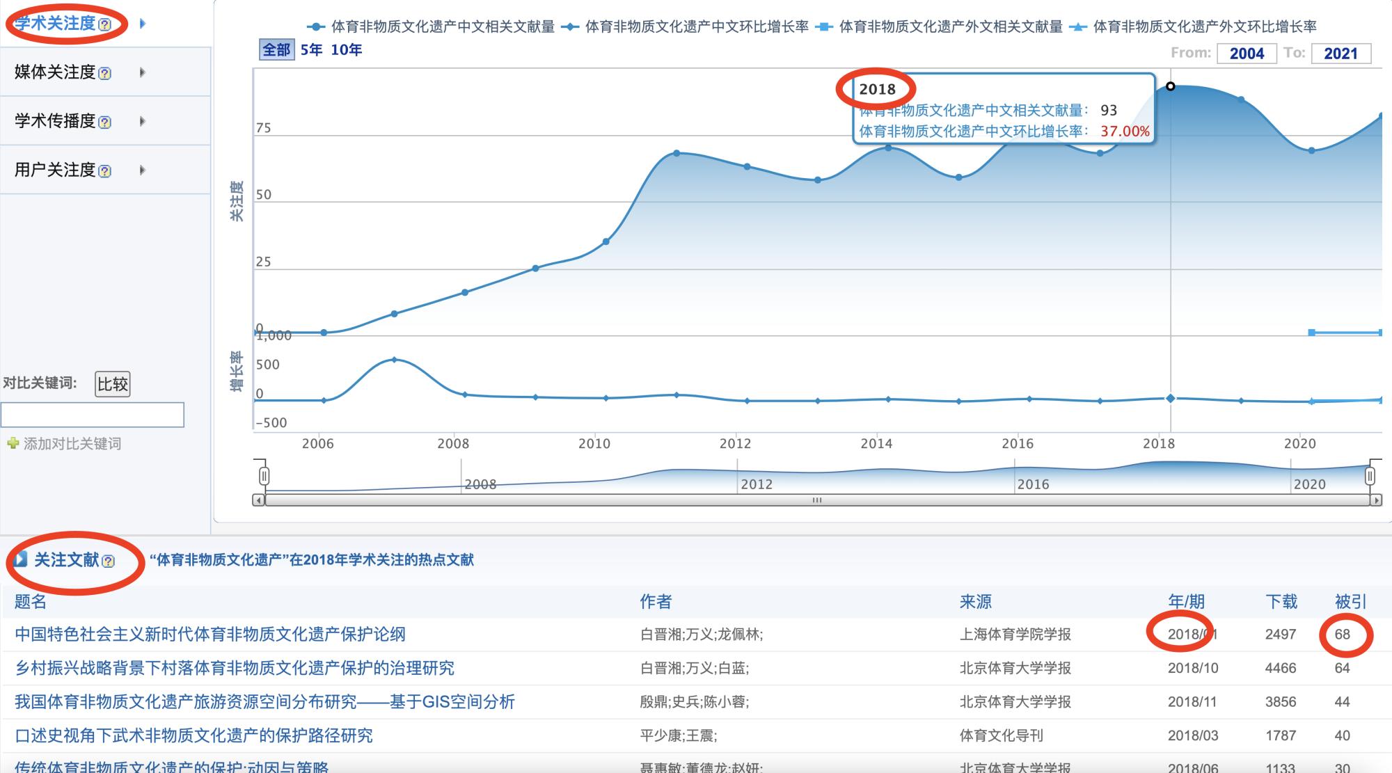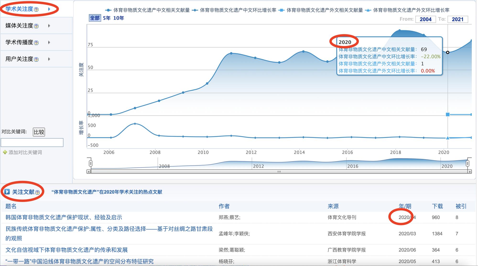 以了解有关“体育非物质文化遗产”的研究热点趋势为例,在指数检索页面的检索框中,输入检索词“体育非物质文化遗产”。在检索结果页面,可以看到有可视化分析,也有文献列表。首先来看看关注度和关注文献。