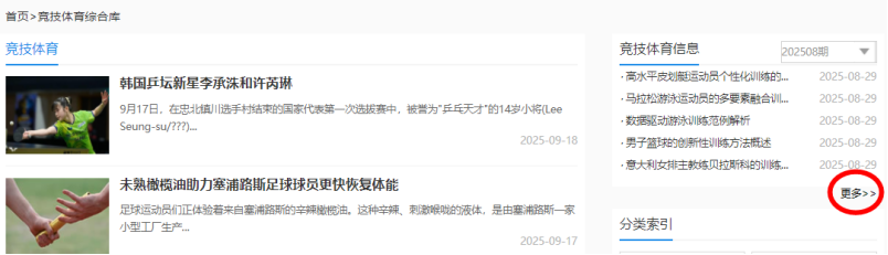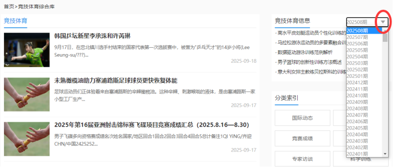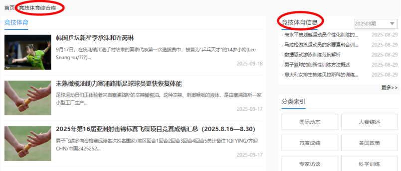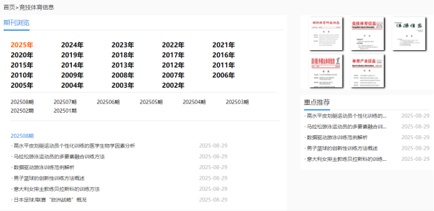 此外,在数据库主页,还可通过“竞技体育”分类导航,链接到“竞技体育综合库”。在页面右侧,找到“竞技体育信息”,也就是《竞技体育信息》刊物。