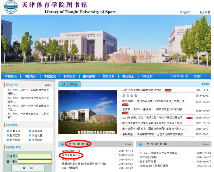 中国体育资讯网是国家体育总局体育信息中心建立的专业体育信息研究网站,包含多种信息刊物和数据库。其中的《竞技体育信息》(月刊),密切关注国内外竞技体育最新发展动态,深度分析和及时报道国外主要对手国家重大赛事备战情况、国内外竞技体育领域重大事件的背景与趋势、国外竞技体育保障体系、运动训练的先进方法与手段、运动训练科技攻关与服务、教练员、裁判员与运动员管理、运动器材与设备、国家队建设、训练基地建设、赛制改革等领域的最新发展动态等。中国体育资讯网访问路径:图书馆官网——中文数据库——中国体育资讯网。