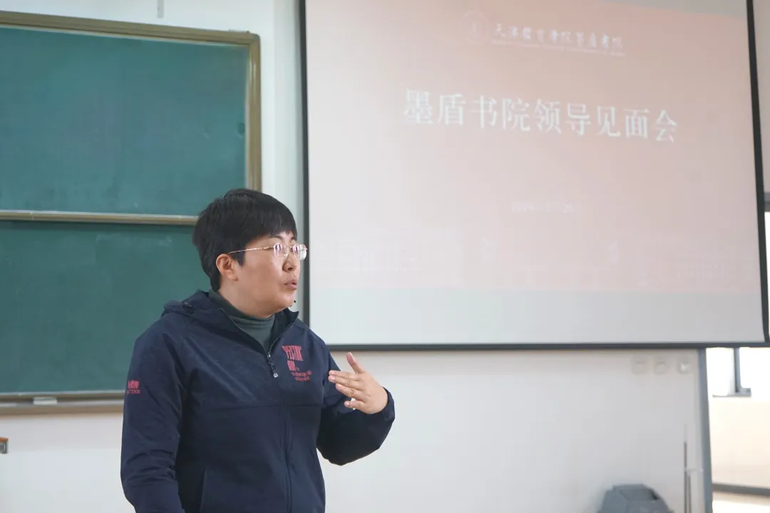 在会上,墨盾书院的创办者之一张院长向大家讲述了墨盾书院的成立背景与发展历程,并结合自身经历,回顾墨盾书院从一支队伍一路发展与成长的故事,引领大家树立明确的奋斗目标、深化了墨盾学子们对书院的认识,增强了同学们作为墨盾书院一员的认同感。