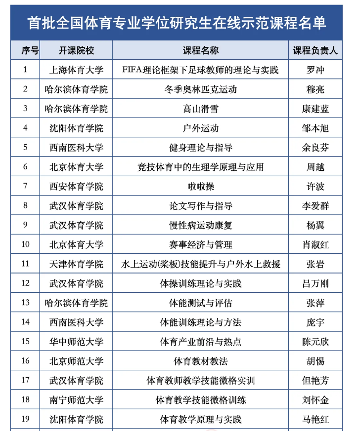近日,全国体育专业学位研究生教育指导委员会印发了《关于公布首批全国体育专业学位研究生在线示范课程名单的通知》(体教秘〔2024〕3号),认定了51门课程为首批全国体育专业学位研究生在线示范课程。其中,我院教师张岩主持申报的课程《水上运动(浆板)技能提升与户外水上救援》获批。下一步,学院将继续以示范课程为引领,以高质量课程建设为着力点,进一步加大课程建设力度,全面提升人才培养质量。