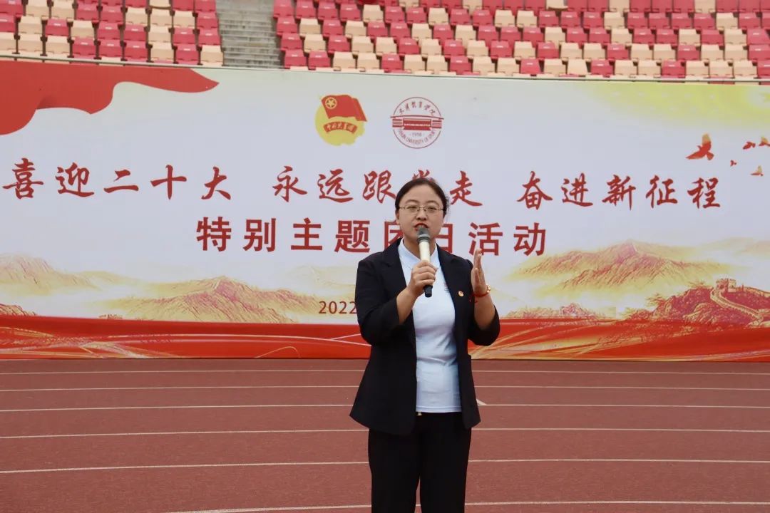 校团委教师兼职副书记、马克思主义学院教师王海燕以“不忘来时路,筑梦新征程”为题,和同学们一起分享开国大典上那些鲜为人知的历史故事。通过今昔对比,使同学们深刻感受到新中国成立73年来所取得的历史性成绩。最后号召同学们在中国特色社会主义新时代,不负青春、不负韶华,将青春梦融入中华民族伟大复兴的中国梦,以最优异的成绩喜迎党的二十大胜利召开。