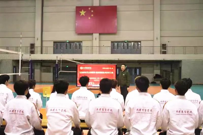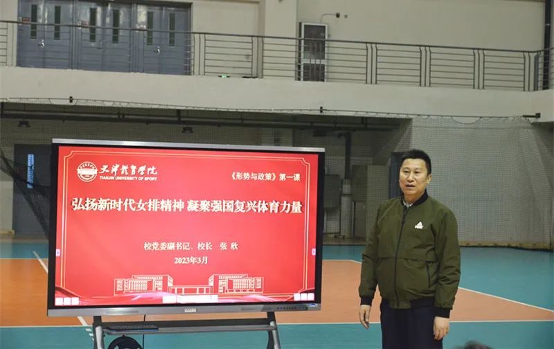 3月23日,党委副书记、院长张欣在排球馆为体育教育学院2021级本科生讲授形势与政策第一课。