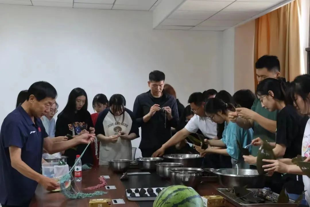 活动当天,老师们把提前泡好的糯米、粽叶、红枣、蜜枣等食材准备就绪。师生们围在一起,捋粽叶、做漏斗状、填糯米、放枣子、压紧实、封口、扎捆,巧手翻飞,一个四角尖尖的粽子就成型了。包粽子过程中,同学们分享各自家乡的端午习俗,相互学习包粽子技巧。经过大家共同努力,一个个各式各样的漂亮粽子制作完成,营造了浓厚的节日氛围。