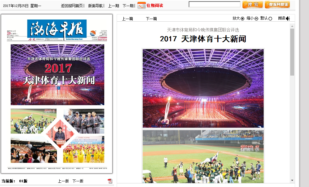 2017年12月25日,《渤海早报》头版刊登了由天津市体育局和今晚传媒集团联合评选的“2017年天津体育十大新闻”,“中国排球学院在津揭牌”入选十大新闻。