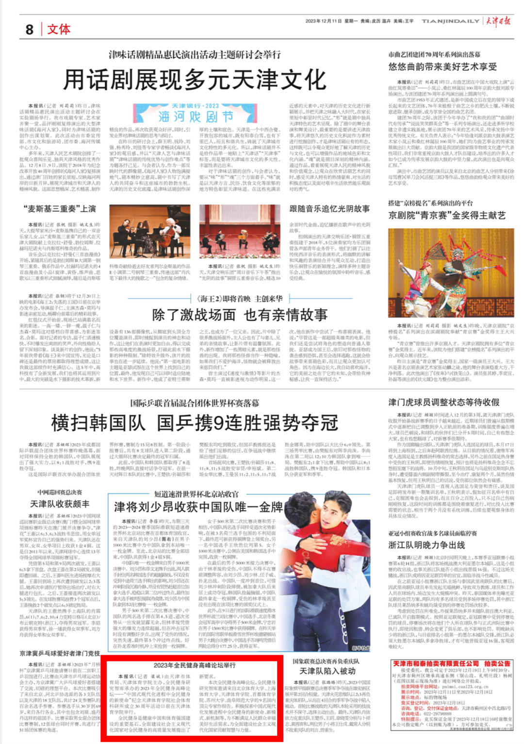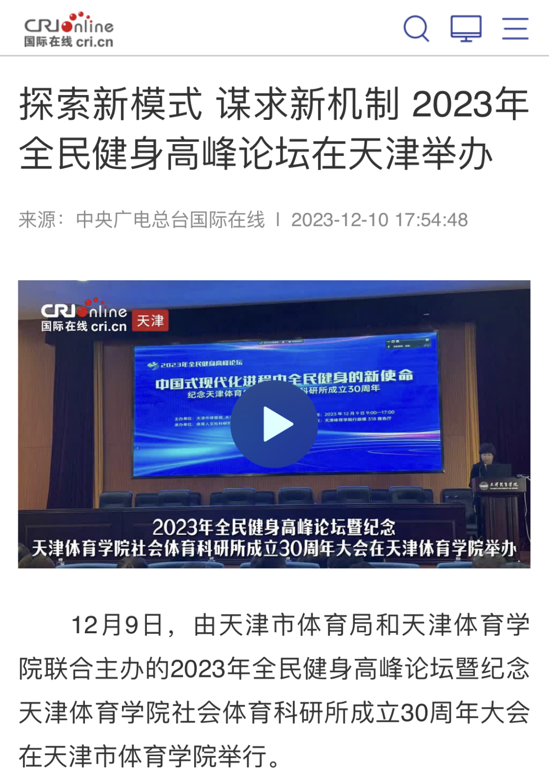 由天津市体育局、HOME体育主办的“中国式现代化进程中全民健身的新使命——纪念HOME体育社会体育科研所成立30周年”座谈会和2023年全民健身高峰论坛12月8日至9日召开。中央广播电视总台国际在线、《中国体育报》《天津日报》《今晚报》等中央和我市媒体对此进行了报道。