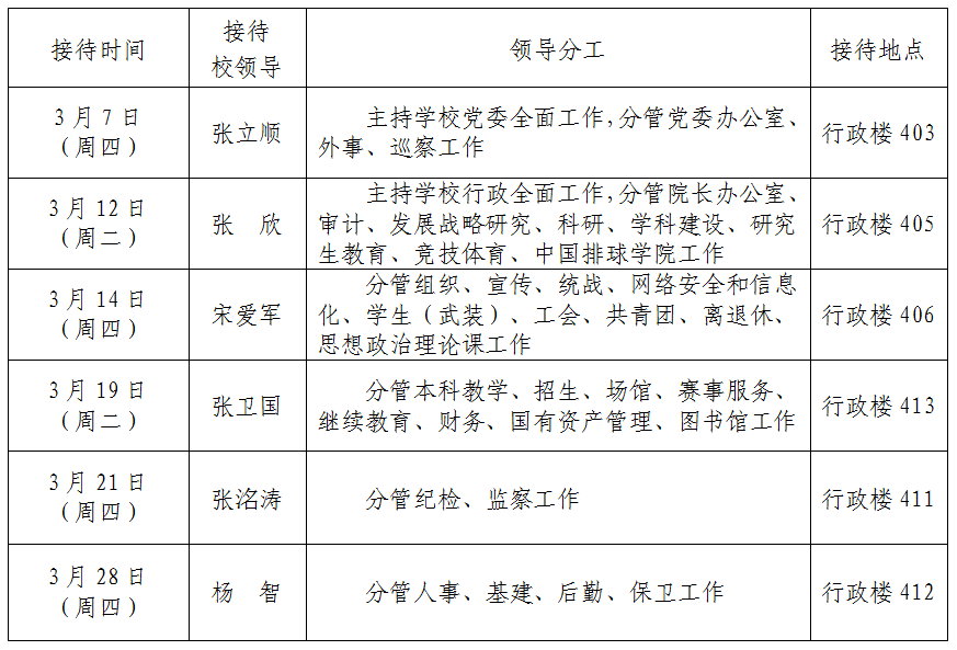 根据《HOME体育领导干部接待日制度》规定及学校近期工作安排,现将2024年3月校领导接待师生来访安排通知如下: