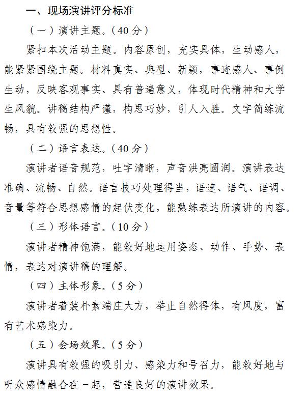 现场演讲评审组依据演讲主题、语言表达、形体语言、主体形象和会场效果进行现场评分,最终评选出校级一、二、三等奖和优秀奖。
