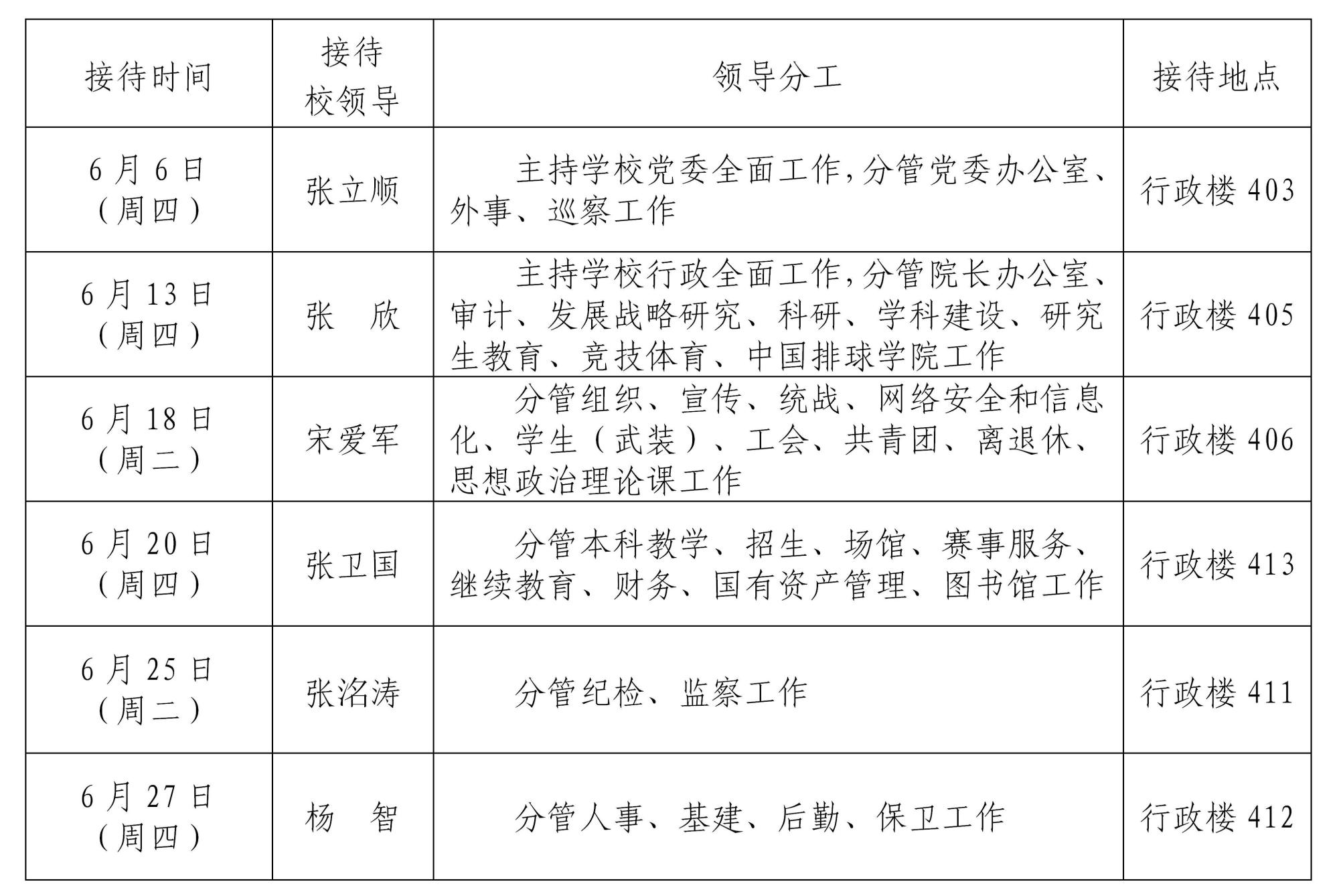 根据《HOME体育领导干部接待日制度》规定及学校近期工作安排,现将2024年6月校领导接待师生来访安排通知如下:
