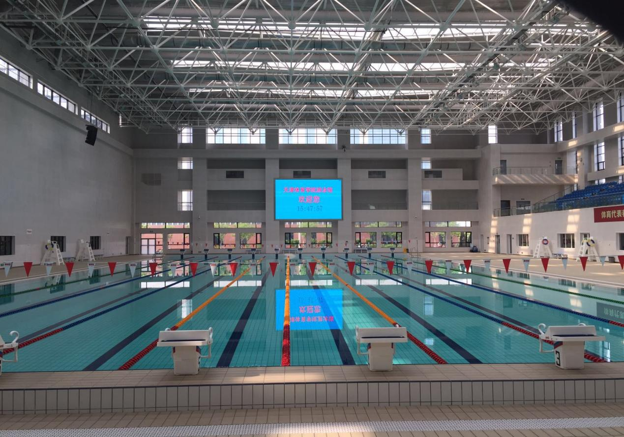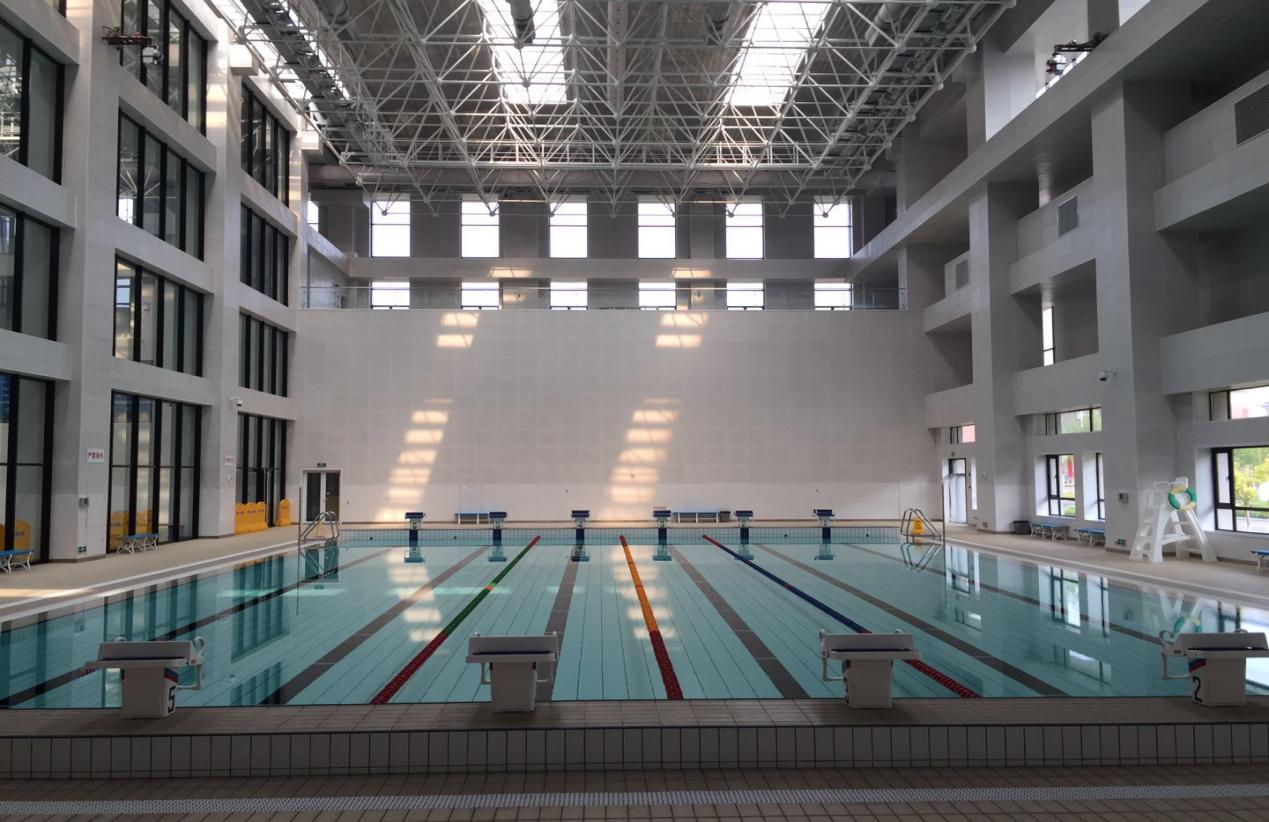 游泳馆建筑面积12505平方米,场地面积4052平方米,内设两个泳池,50米泳池标准泳道10条、25米泳池标准泳道6条,观众座席505个,电子显示屏。附属设施包括:器材室、贵宾室、更衣室、淋浴室、力量房等,并有良好的取暖、通风和先进的净化水设备。目前主要用于教学、训练,可承接各类游泳项目比赛及训练。